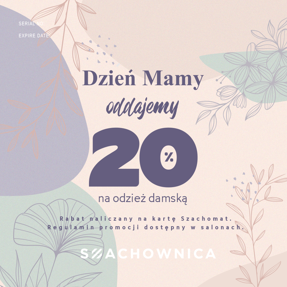 Z tej okazji w sklepie stacjonarnym Szachownica przygotowano dla Was ekstra rabaty 20% zwrotu na kartę #szachomat za zakup odzieży damskiej! Nie zwlekajcie i odwiedźcie Szachownicę już dziś!